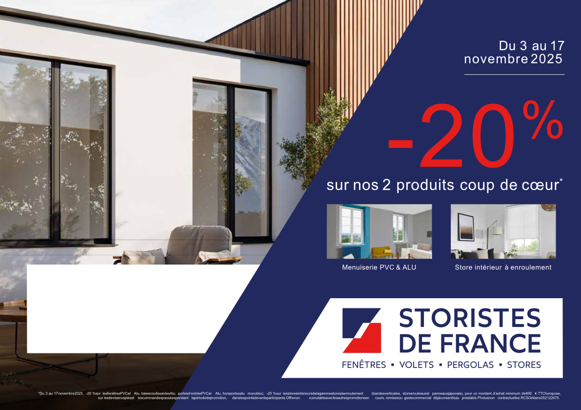 *Offres valables du 03 au 17 novembre 2025. 20% de remise sur les menuiseries PVC et Aluminium ainsi que sur les stores intérieurs à enroulement. Voir conditions en magasin.